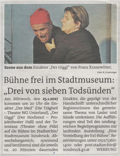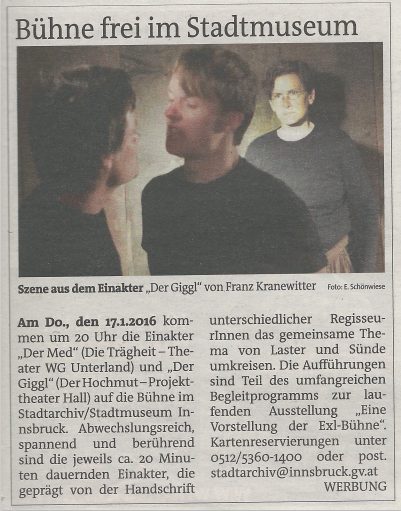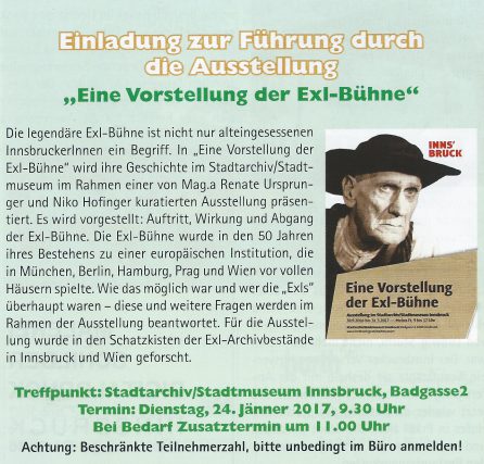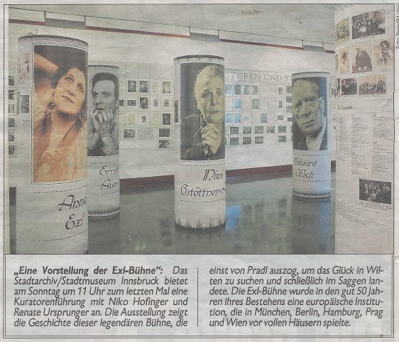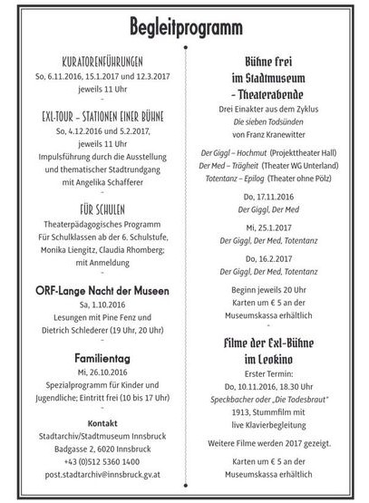 Il palcoscenico dell'Exl è una leggenda. Da Innsbruck, il teatro amatoriale ha conquistato tutta l'Europa. Si esibì a Vienna e Berlino, a Milano e Bruxelles. La mostra è dedicata alla storia di questo straordinario gruppo teatrale, ai suoi grandi attori, ai suoi successi e ai suoi lati oscuri.