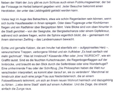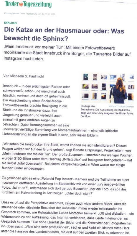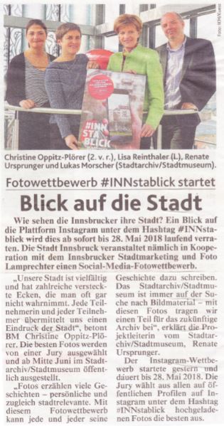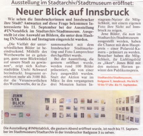 Come vedono gli abitanti di Innsbruck la loro città? Il concorso fotografico su Instagram "#INNstablick. La mia Innsbruck sulla soglia di casa" invitava le persone a catturare questa visione personale. Una selezione della diversità è stata esposta nella mostra. Una giuria ha selezionato 104 foto tra le oltre 3.100 pervenute, che sono state esposte nell'Archivio della città di Innsbruck/Museo della città.