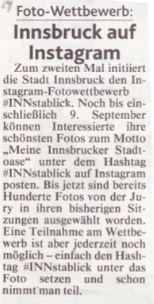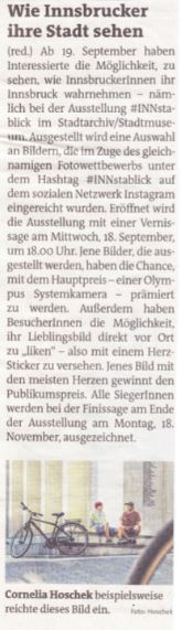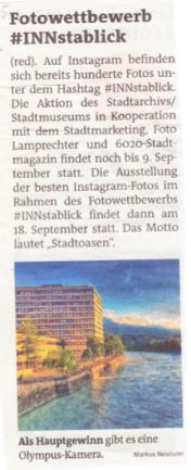 L'obiettivo del concorso fotografico "#INNstablick - Meine Innsbrucker Stadtoase", organizzato per la seconda volta dalla città di Innsbruck in collaborazione con Innsbruck City Marketing e Foto Lamprechter, era quello di ottenere diverse prospettive e punti di vista su Innsbruck. Tra gli oltre 1.200 contributi postati sui profili Instagram pubblici con l'hashtag #INNstablick, una giuria ha selezionato un totale di 72 foto che sono state esposte nell'Archivio della città di Innsbruck/Museo della città. Quasi 1.760 persone hanno visitato la mostra fotografica. Le dieci foto migliori sono state premiate il 18 novembre.
