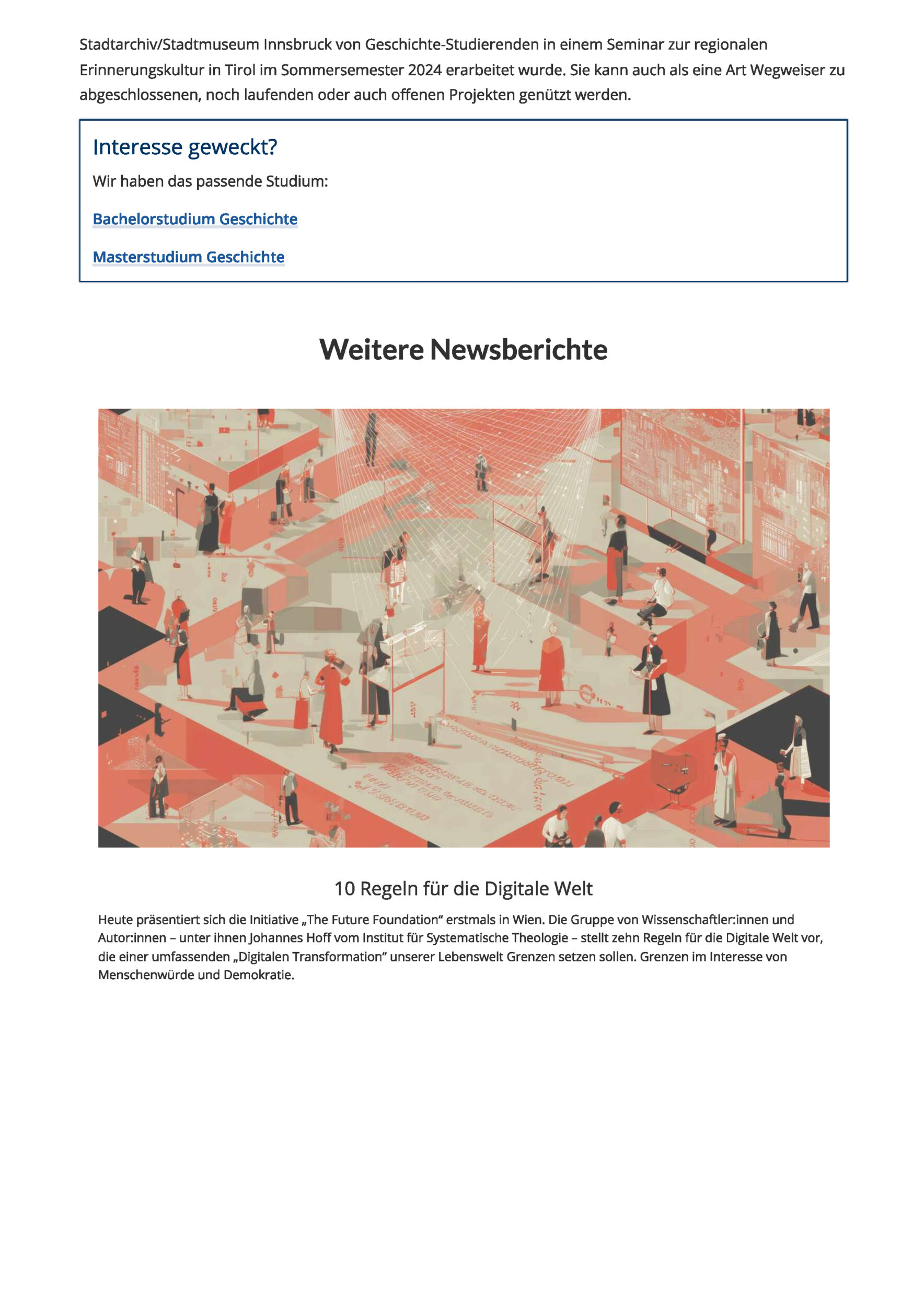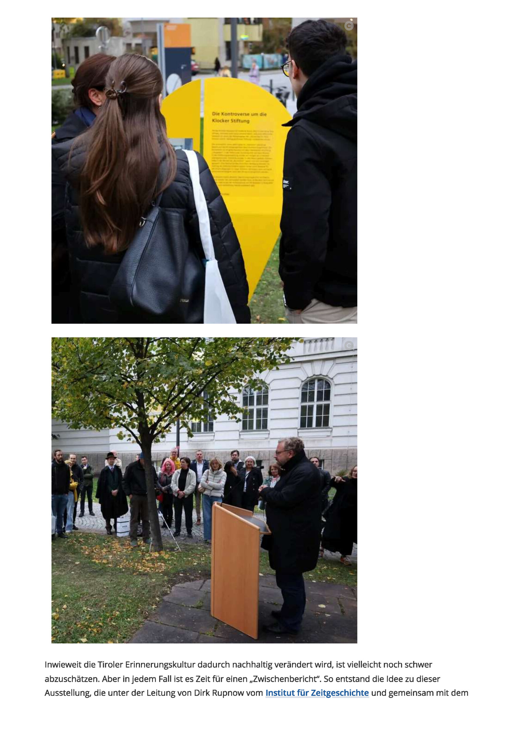 È forse ancora difficile valutare in che misura questo cambierà in modo permanente la cultura tirolese della memoria. In ogni caso, è tempo di un "rapporto intermedio". È così che è nata l'idea di questa mostra, sviluppata insieme agli studenti di storia in un seminario sulla cultura regionale della memoria in Tirolo (semestre estivo 2024). Può essere utilizzata anche come una sorta di guida ai progetti conclusi, in corso o aperti.