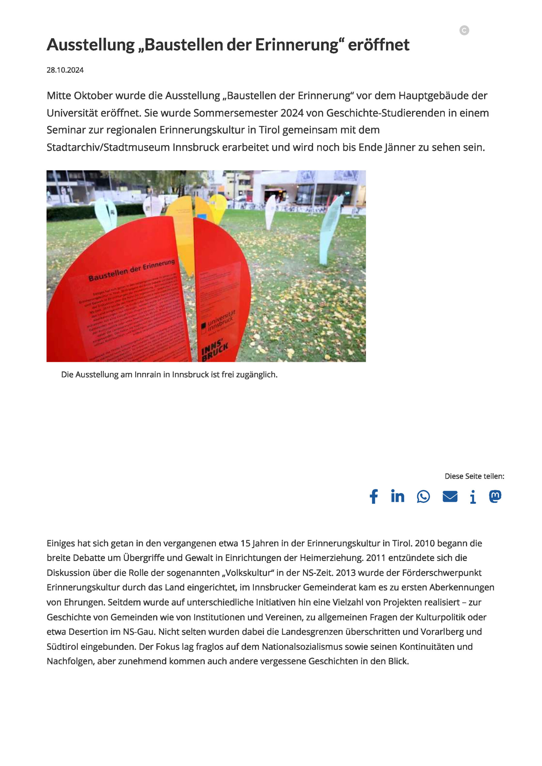nel 2010 è iniziato l'ampio dibattito sulle aggressioni e le violenze nei centri di accoglienza. nel 2011 si è acceso il dibattito sul ruolo della cosiddetta "cultura popolare" nell'era nazista. nel 2013 lo Stato ha istituito un finanziamento per la cultura della memoria e il Consiglio comunale di Innsbruck ha revocato le prime onorificenze. Da allora sono stati realizzati numerosi progetti su diverse iniziative: sulla storia dei comuni, delle istituzioni e delle associazioni, su questioni generali di politica culturale o, ad esempio, sulla diserzione nel Gau nazista.