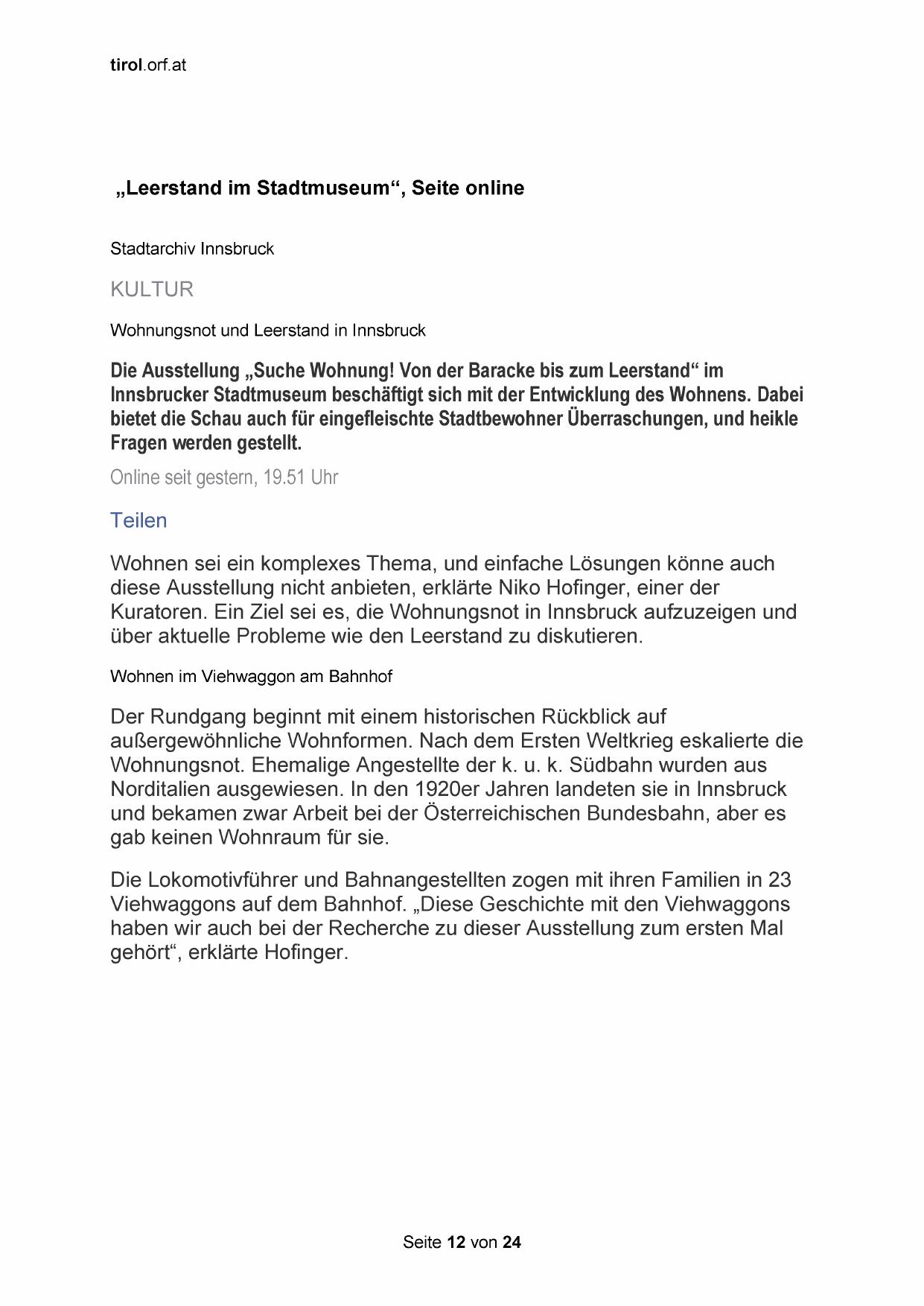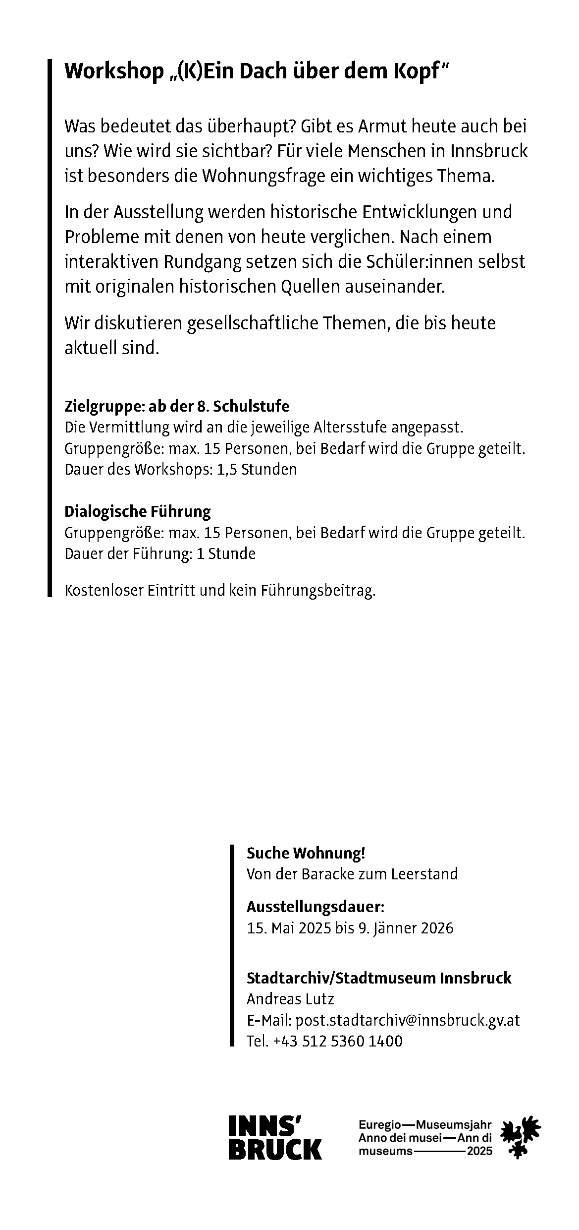 La questione abitativa è attualmente al centro dell'attenzione dell'opinione pubblica e dei politici più di qualsiasi altro argomento. Non si tratta di un fenomeno nuovo a Innsbruck, per questo la mostra è dedicata alla risposta della città a questi problemi negli ultimi cento anni.